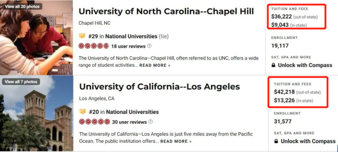 公立大学对于州内(In-state)学生的学费还相对比较友善,一般一年$10,000上下;州外(Out-of-state)的学生,学费翻4倍,一年要$40,000的样子。