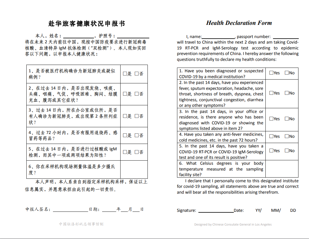 二、自2020年12月31日(星期四)起,所有从洛杉矶出发赴华的乘客,须在采样现场认真填写并签署《赴华旅客健康状况申报书》(指定采样机构备有纸质版,填写签署后由采样机构留存),如实申报近期身体健康状况。
