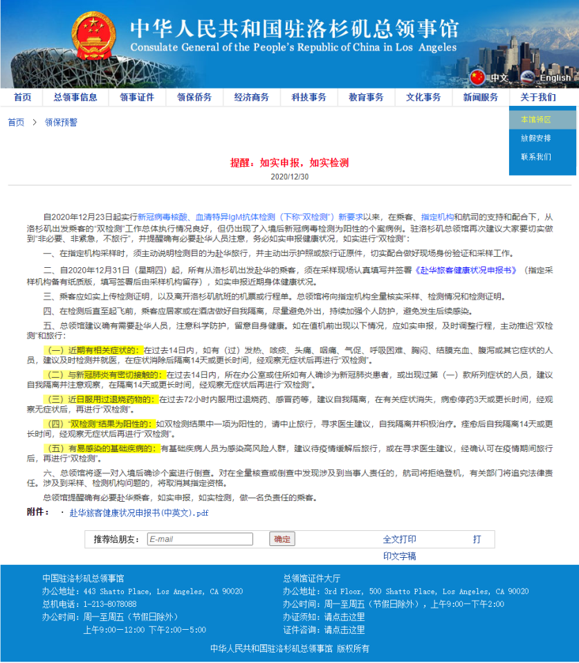 中国驻洛杉矶总领馆在12月30日发表一份声明,声明中强调所有回国的民众必须到指定的机构进行“双检测”,并增加了一项内容——去检测的民众,必须在采样现场填写《赴华旅客健康状况申报书》,如实申报近期身体状况。