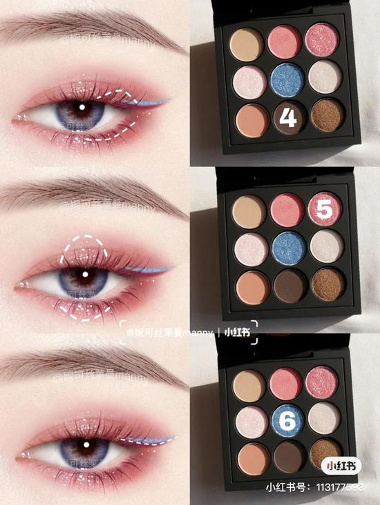 嘿嘿,这款温柔撞色妆是不是既仙气又出众?!粉色作为主色调,温柔之中透露着满满少女感,再加上眼尾的蓝色点缀,瞬间多了一股灵气,粉蓝撞色真的太可了!