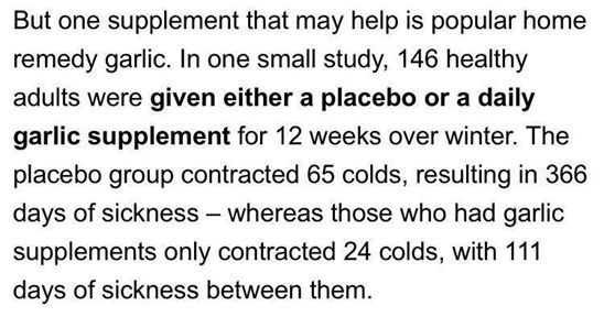 2001年的时候,英国做了一项研究(虽然试验范围不大,只选取了146名志愿者)。研究人员在那个冬天给2组志愿者分别发了12周的安慰剂和大蒜补充剂。