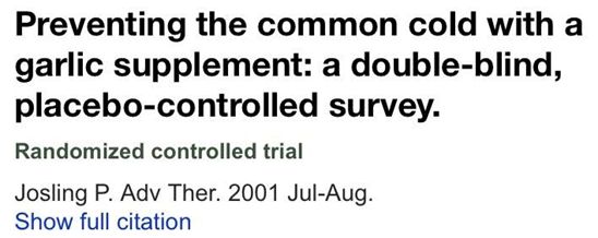 结果发现用了大蒜补充剂的这一组,无论是患感冒的次数、得了感冒以后的持续天数,都只有对照组的1/3。