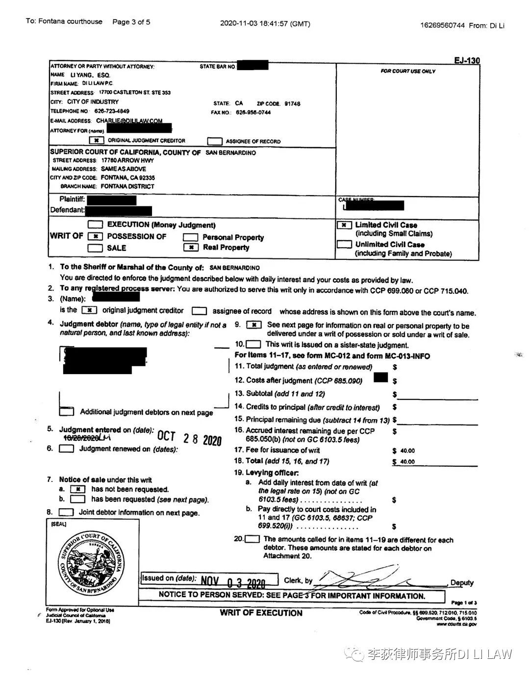 2020年9月17日 | 本律所代理房东向Fontana法院提交驱赶房客的起诉材料。 |