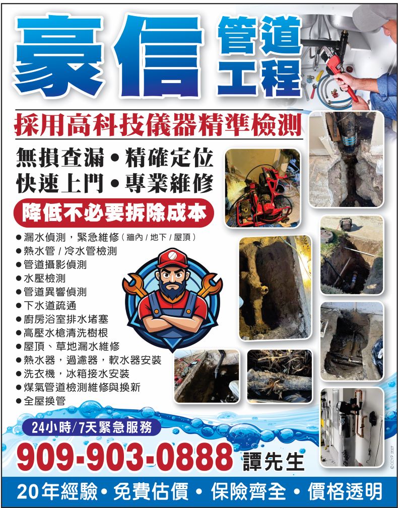在日常生活中,无论是漏水、堵塞,还是老旧管道带来的各种隐患,都会严重影响居家与商业环境的正常运作。位于南加州的豪信管道工程,凭借超过20年的...