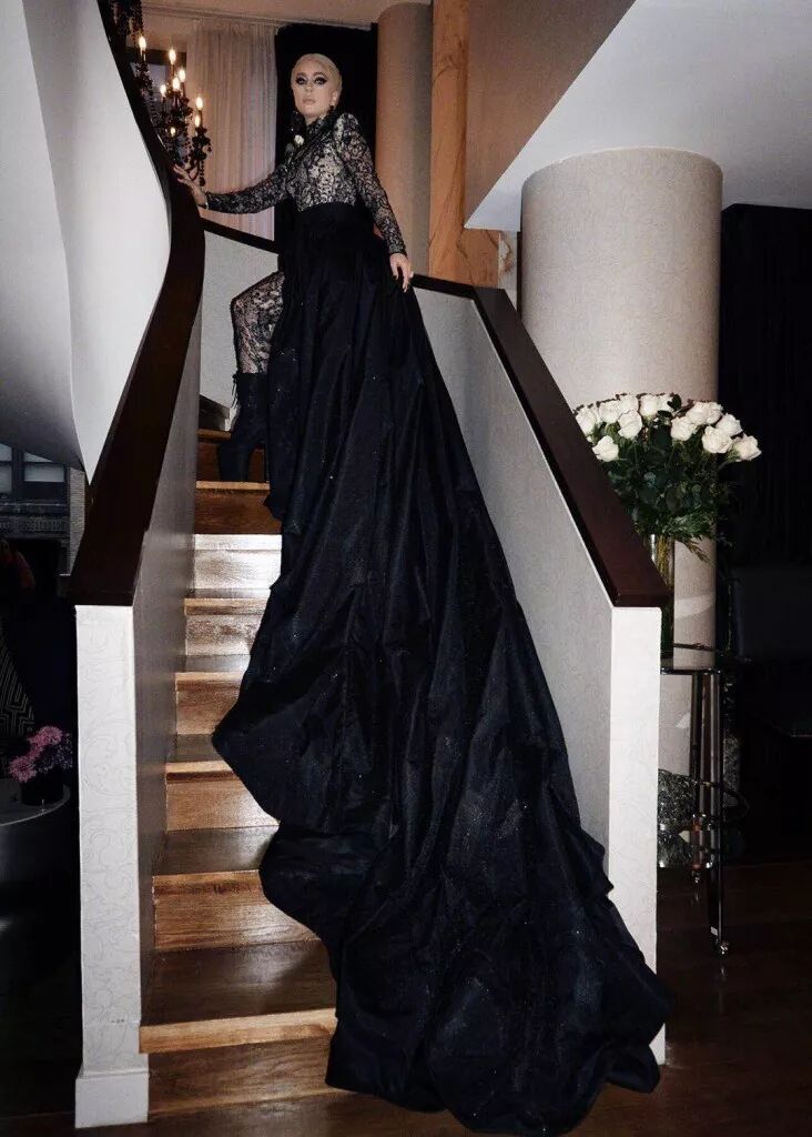 除了白玫瑰,今年的红毯最惹人注目的歌手,依然无疑是Lady Gaga了。一身黑色蕾丝长裙,气场直逼两米八,可以说十分复古妩媚。