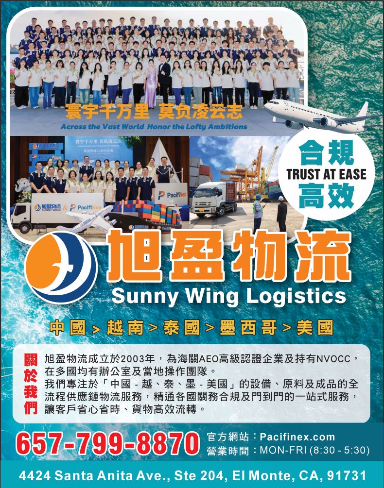 旭盈物流/SUNNY WING專精於倉儲及物流。旭盈物流/SUNNY WING的辦公地址在4424 Santa Anita Ave., #204, El Monte, CA, 91731,公司電話是(657) 799-8870該商家的關鍵詞包含:報關行 華人報關行 运输 倉儲 貨運代理 內陸運輸 進出口 洛杉磯貨運代理 洛杉磯報關行 洛杉磯內陸運輸 海運 空運 拖車 配送 申報 陸運 跨境商務 跨境貿易 電商 Type86 FBA SEC321 關稅 保稅 泰國物流 泰國清關 泰國貨運 越南物流 越南清關 越南貨運 墨西哥物流 墨西哥清關 墨西哥貨運 Mexico Thailand Vietnam Forwarder Freight Bond FDA