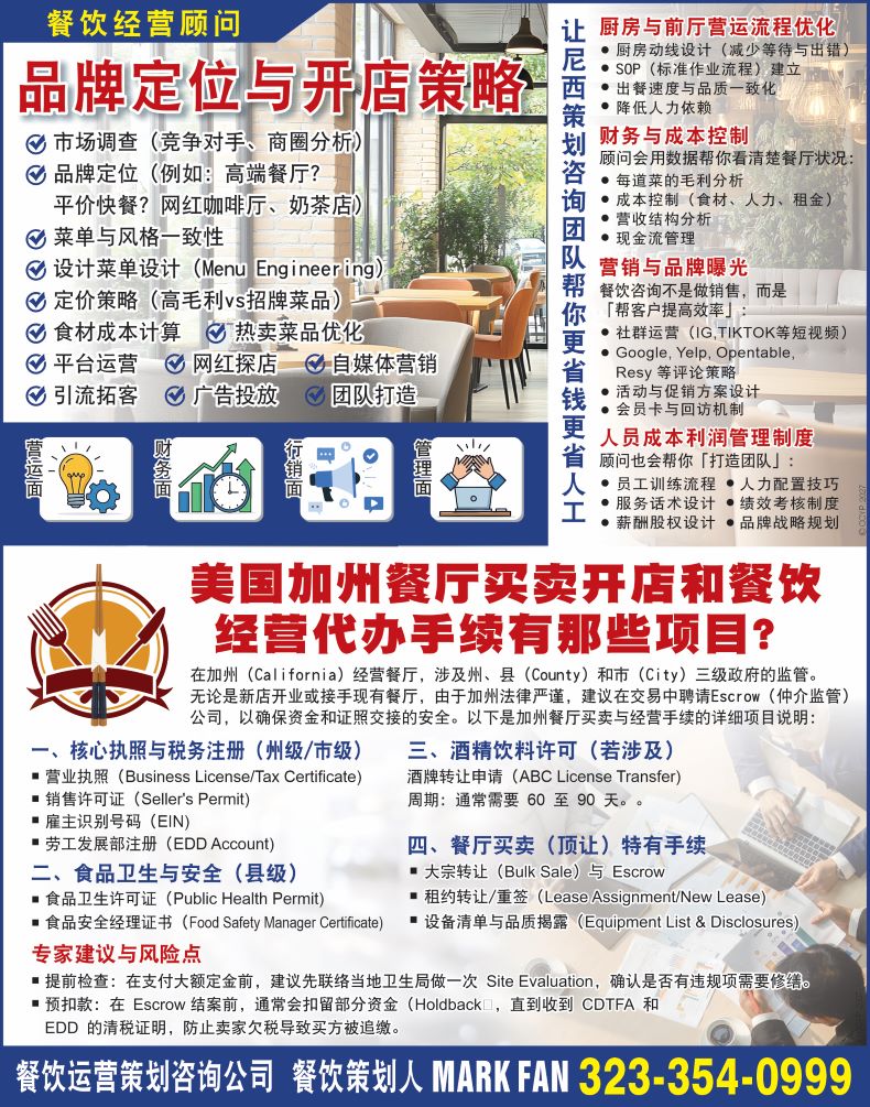 尼西傳媒策劃諮詢/JEHOVAH NISSI LINK MEDIA, INC.專精於餐館營運策劃諮詢公司,餐館設備及供應。尼西傳媒策劃諮詢/JEHOVAH NISSI LINK MEDIA, INC.的辦公地址在200 E. Garvey Ave., #110, Monterey Park, CA, 91755,公司電話是(323) 354-0999該商家的關鍵詞包含:餐飲經營顧問 開店策略 品牌定位 市場調查 廚房流程優化 設計菜單 定價策略 食材成本 廚房動線 出餐速度 現金流管理 行銷 品牌曝光 餐飲諮詢 活動促銷 員工訓練 人力配置 餐飲經營代辦手續 食品衛生 食品安全 餐廳買賣